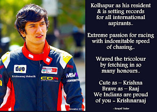| It was 2012, Shantiniketan school assembly time, I was waiting for my turn to go on stage and announce about this young boy who achieved remarkable feats in motor racing. I had a small talk with him that day, and was damn surprised to know about all his achievements. Above all, though he being a Hero, a Champion of motor racing and a son of a politician, he was still down to earth, what impressed me most was his humbleness. August 2017, he not only made Kolhapur but the whole of nation proud by his remarkable achievement to be the 2nd Indian to win BRDC British Formula 3. This is for you Krishnaraj.. Cheers |