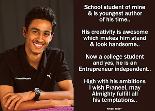| I met him first at Sanjeevan Knowledge City, Panhala in 2014-15. He was a 10th std student. I was very surprised that at such a tender age he wanted to publish a book. I tried my best to guide him and even I was motivated as this was the very first time I came across the youngest author. Praneel, I know, its too late to appreciate you for this, but then, better late than never.. So this is for you.. I am sure you will go a long way and achieve all your desired goals.. |