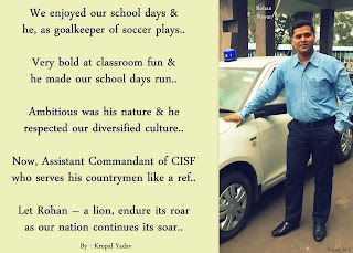 | We represented our school football team for three consecutive years. He stood as a goalkeeper and me as a left defender. Not just the football ground, but the classroom was also fun because of him. He along with other teammates used to always encourage me. He failed a number of times, to specify, we both had a tight slap from our teachers but then, today he has proved his will.. I feel proud to have a friend like him.. Though not together today, hope this small gesture of poem helps him recall our school days.. dedicated to Rohan Powar |