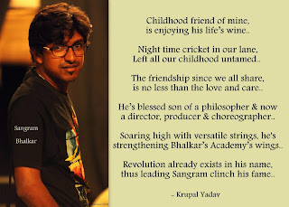 | Since childhood, we have been together, and why shouldn’t we, not because we are neighbours, but friends forever. Enjoying all the festivals, playing cricket during the weekends, street cricket, the best of all, a note with a whistle to call each other :D Now he is no less than a star, he has nailed his name in the film industry.. Though a hero behind the curtains, is now an inspiration for his assistants.. let this heroic friend of mine, shine all the time.. Happy Birthday Sangram.. hope you like this little gesture of mine.. |