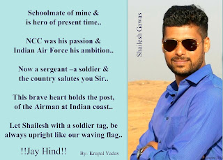 | We pursued our education together at Chhatrapati Shahu Vidyalaya, Kolhapur. I remember him as a decent, honest and noble friend, who in-spite was with a skinny frame, made his way to Delhi Parade. Though was shy in nature, today he stands as a brave soldier. Not only me, but the entire country is proud of you, and why not, it takes a lot of courage to be a part of Indian Air Force. Trust me; the youth out there look at you as an inspiration. & so a small gift of poem .. We salute Shailesh Sir.. # Respect !!Jay Hind!! |